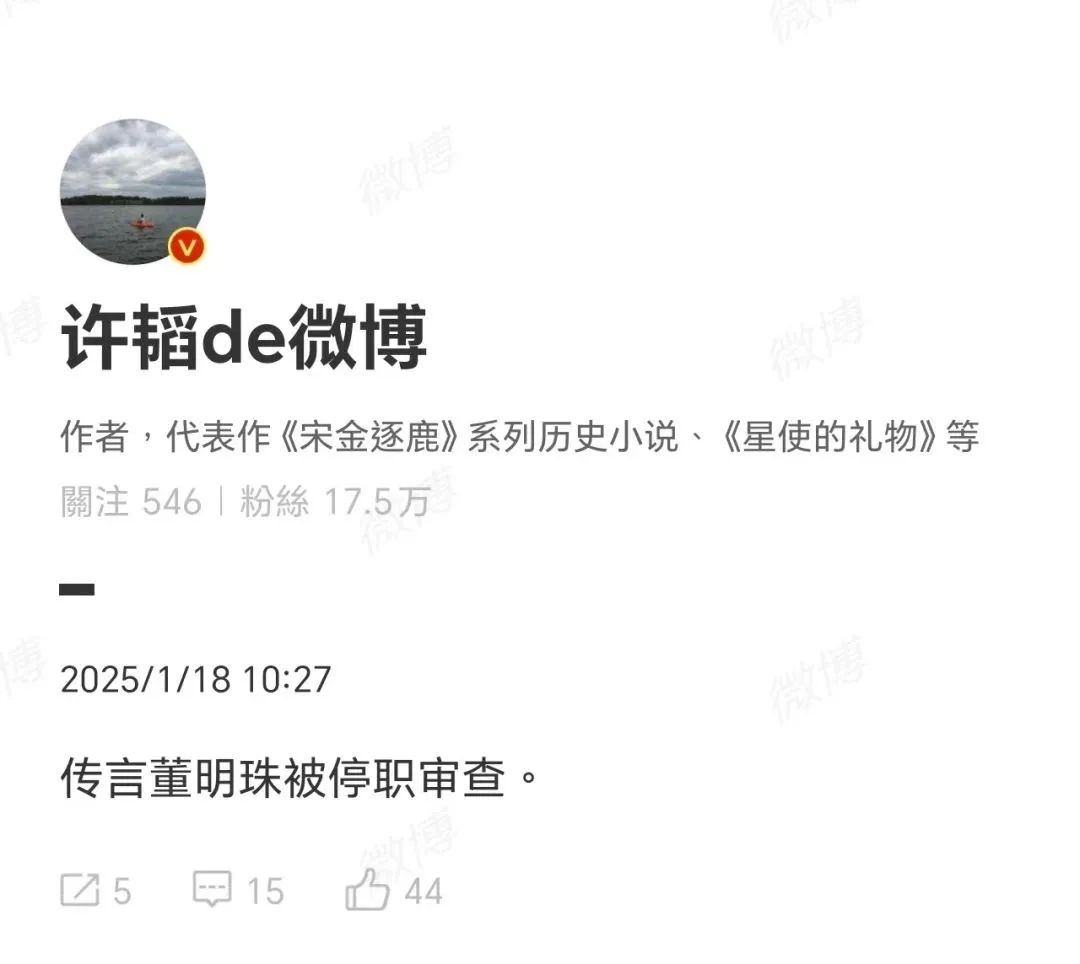 1月18日,微博用户“许韬de微博”发文称“传言董明珠被停职审查”。对此,@格力文传发表声明回应,“该信息纯属无中生有、恶意中伤的谣言。该用户肆意编造并发布虚假信息,严重误导公众,对我司及高管的名誉权造成了恶劣影响。我司将坚决采取法律措施,追究其法律责任,维护上市公司及高管的合法权益”。
